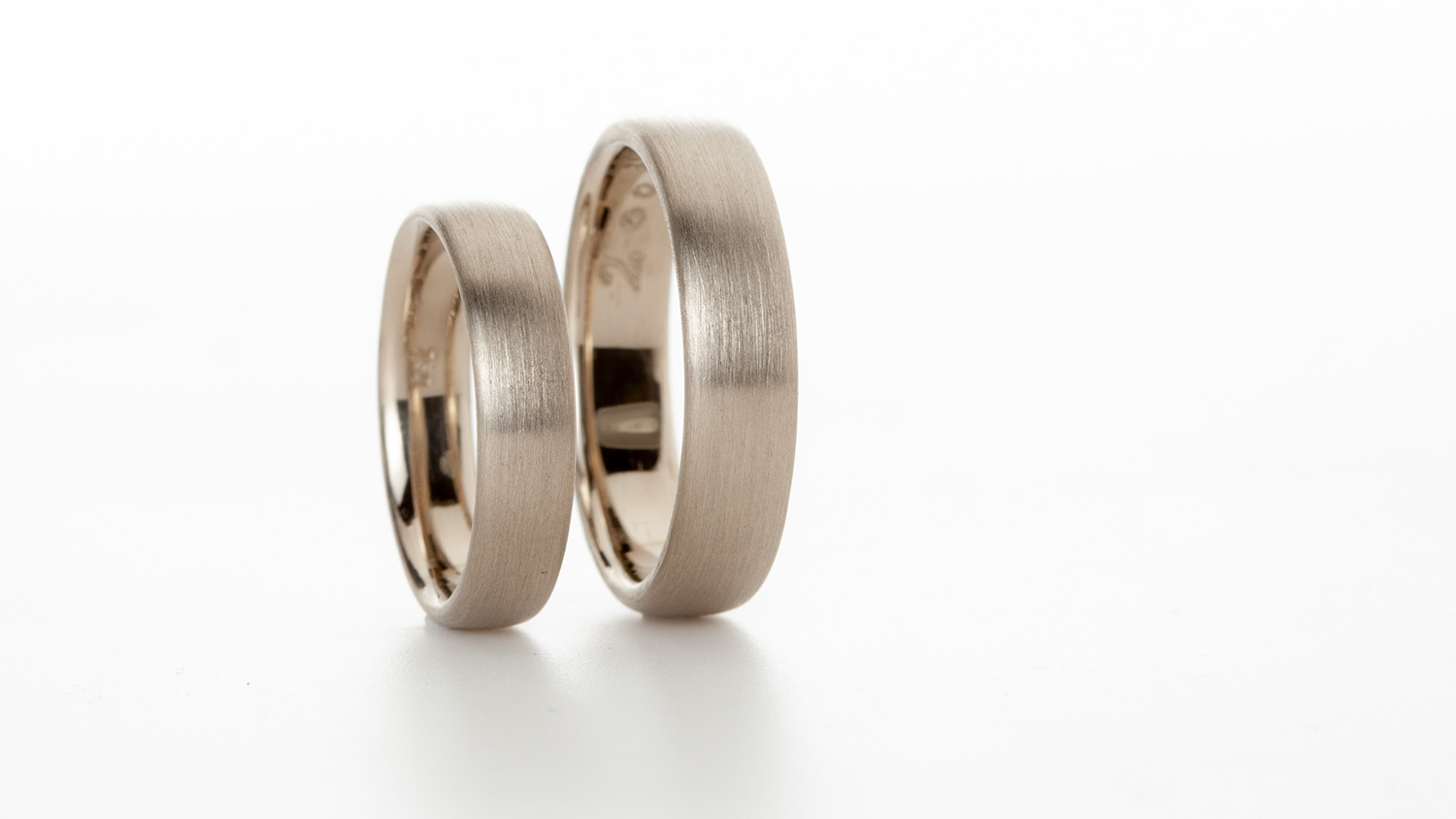 Grün-, Gelb-, Rot- oder Roségold, Champagnergold, Palladium und Platin – oder doch Haselnussgold – unterschiedliche Materialien, Formen und Strukturen für jeden einzigartigen Menschen. Auch mehrfarbige Kombinationen sind möglich. Finden wir heraus, welche Farblegierung am besten mit Ihrem Teint, Haarfarbe und Augenfarbe harmoniert. Die Legierung bestimmt den Anteil des vorhandenen Goldes oder Platins in einem Schmuckstück. Das Profil des Trauringes ist abhängig von Ihren Vorlieben und Tragekomfort. Die Proportionen sollten mit Ihrer Hand harmonieren. Die Oberfläche lässt sich unterschiedlich bearbeiten und so verschiedene optische Wirkungen erzielen. Eine matte Oberfläche verschmilzt mit der Haut, während eine polierte Oberfläche das Licht und die Umgebung reflektiert. Doch erst durch die persönlichen Tragespuren erhält der Ring seinen Charakter & Lebendigkeit.